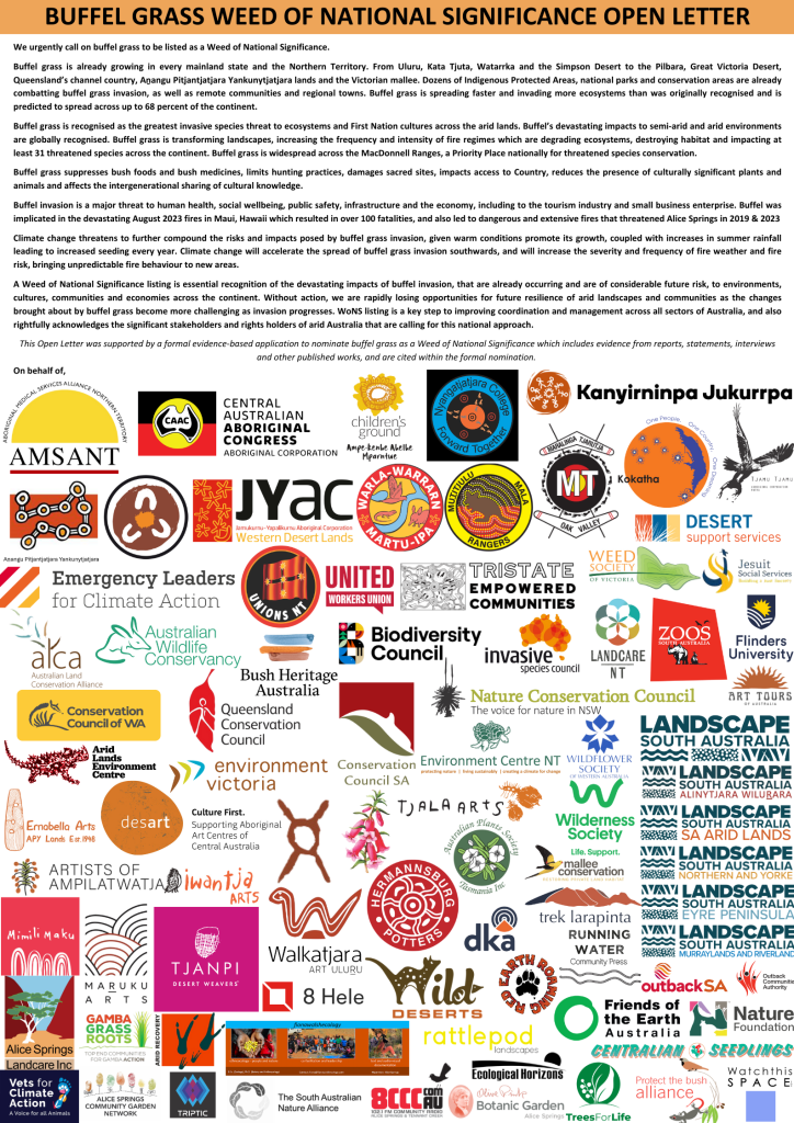 Listing Buffel Grass as a Weed of National Significance has consensus. It has consensus among 83 organisations, representing many rightsholders, stakeholders, on-ground managers, small business holders, knowledge holders and major players in the rangelands of Australia. These 83 organisations signed the Open Letter in support of listing Buffel Grass as a WONS, in January 2025. Quite simply, these organisations represent a considerable diversity of Australia’s rangelands, they remind us that there are so many interests, values and opportunities for the future of rangelands, and these groups are united behind the challenge of buffel grass.